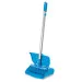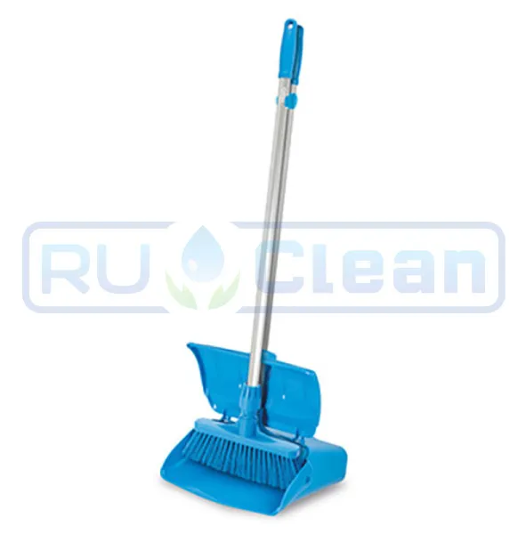 Набор для уборки, состоящий из небольшого веника и пылесборника для уборки вестибюля с крышкой и колесиками, снабженных зажимами для крепления их друг к другу.