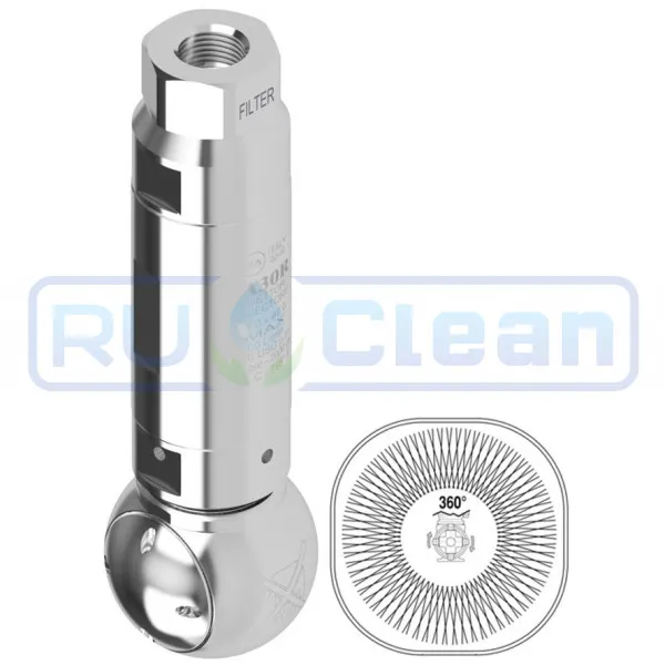 Данный очиститель емкостей работает от гидропривода (вращение форсунок происходит за счет потока воды, протекающего через насадку). Насадка обеспечивает мойку на 360 градусов (полная сфера). Предусмотрено крепление 4-х форсунок с резьбой M4 (не входят в комплект поставки!)