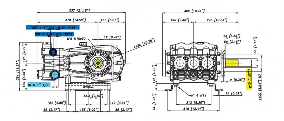 Плунжерный насос высокого давления с кривошипной передачей Bertolini CX 6521. Номинальное давление 210 бар, расход воды 66 л/мин, частота вращения вала 1000 об/мин. Гладкий вал 40мм, шпонка.