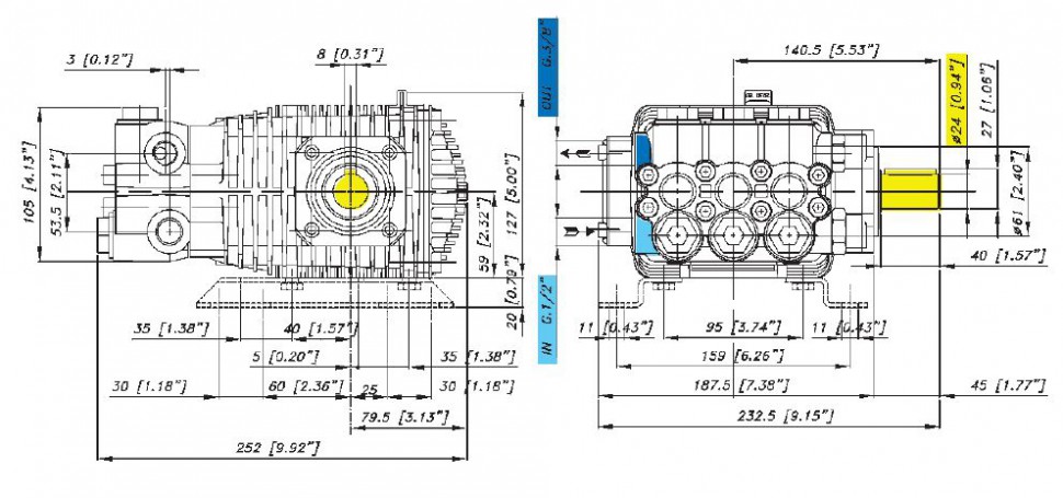 Плунжерный насос высокого давления с кривошипной передачей Bertolini TML 1728-HP. Номинальное давление 280 бар, расход воды 16,8 л/мин, частота вращения вала 1450 об/мин. Гладкий вал 24мм, шпонка.