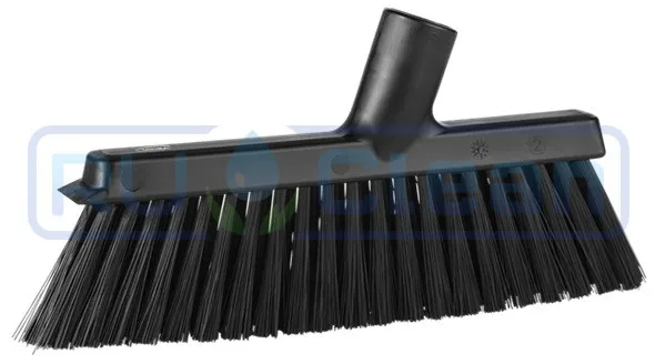 Легкая и особо эффективная щетка для подметания как сухого, так и влажного мусора. В рисунке ворса используются щетинки двух разных диаметров. Внешний ряд щетинок состоит из более мягкого ворса, чем средний, что позволяет не пропустить ни соринки. Ворс у края-скребка расположен под углом, что позволяет выметать мусор у самой стены и из углов, а также из-под рабочих столов и т.д. В конструкции предусмотрен эффективный край-скребок для оттирания с поверхностей присохшей грязи.