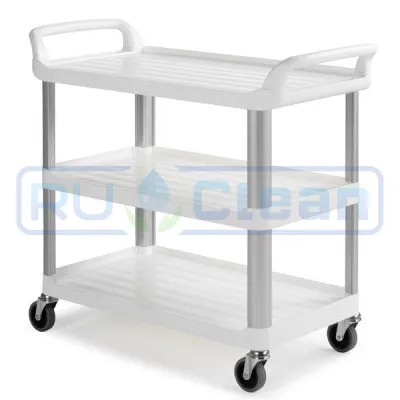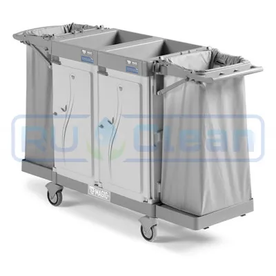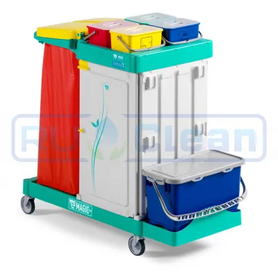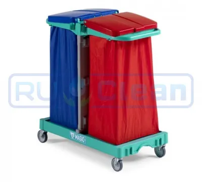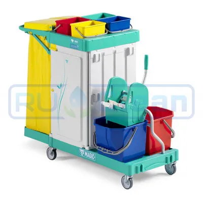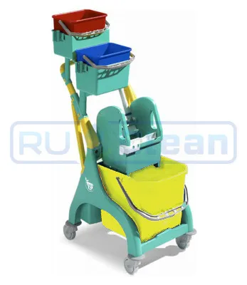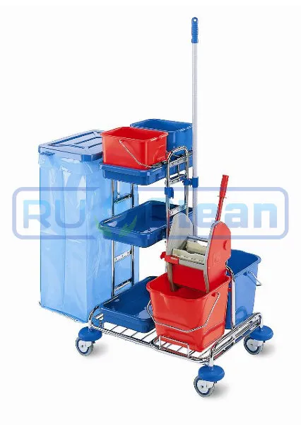 Тележка многофункциональная Euromop. Рама выполнена из хромированного металла, на четырех поворотных колесах диаметром 100 мм. с противоударными бамперами диаметром 120 мм. 2 ведра (синее и красное) по 15 л. Оснащена механическим отжимом для мопа. 3 пластиковых лотка (270х450х70 мм), в верхнем лотке устанавливаются 2 дополнительных пластиковых ведерка емкостью по 9 л (синее и красное). Держатель мешка для мусора рассчитан на стандартные полиэтиленовые мешки для мусора объемом 120 л. Мешок крепится к держателю тремя пластиковыми клипсами.