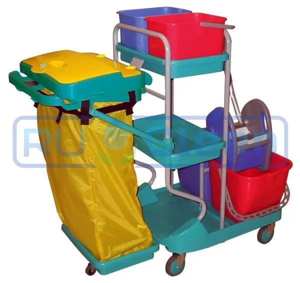 Многофункциональная уборочная тележка на пластиковой раме с двумя ведрами 15 л, дополнительными ведрами 9 л, пластиковыми лотками, держателем мешка для мусора объемом 120 литров (мешок в комплект не входит), универсальным отжимом. Уборочные тележки такого типа используются для уборки больших помещений и позволяют удобно разместить всё необходимое для уборки.